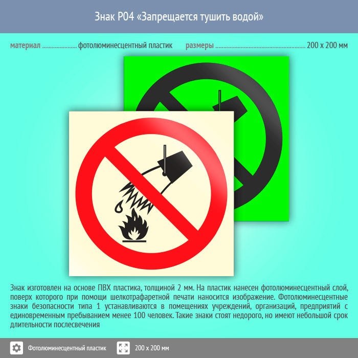 Знак P04 «Запрещается тушить водой» (фотолюминесцентный пластик, 200х200 мм) в Черкесске купить