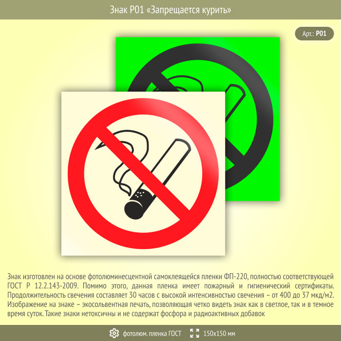 Знак P01 «Запрещается курить» (фотолюминесцентная пленка ГОСТ 34428-2018, 150х150 мм) в Черкесске купить