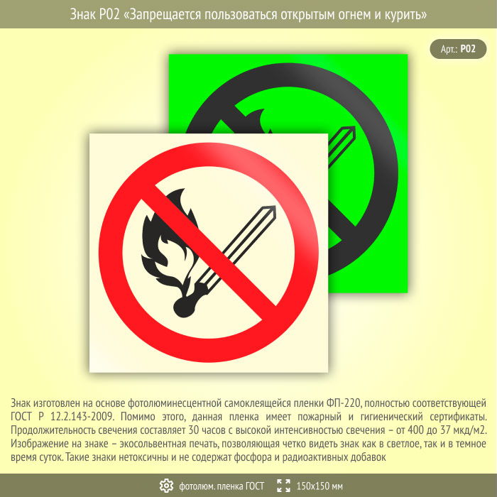 Знак P02 «Запрещается пользоваться открытым огнем и курить» (фотолюминесцентная пленка ГОСТ 34428-2018, 150х150 мм) в Черкесске купить