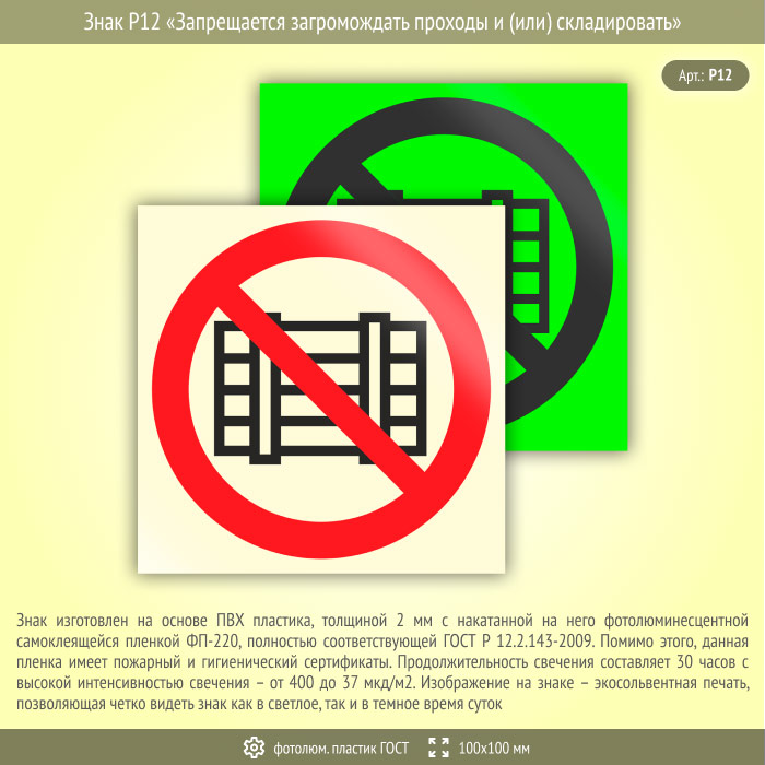 Знак P12 «Запрещается загромождать проходы и (или) складировать» (фотолюминесцентный пластик ГОСТ 34428-2018, 100х100 мм) в Черкесске купить