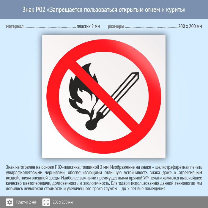 Знак P02 «Запрещается пользоваться открытым огнем и курить» (пластик, 200х200 мм) в Черкесске купить