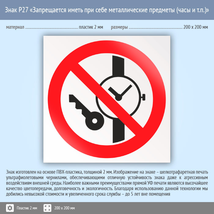 Знак P27 «Запрещается иметь при (на) себе металлические предметы (часы и т.п.)» (пластик, 200х200 мм) в Черкесске купить