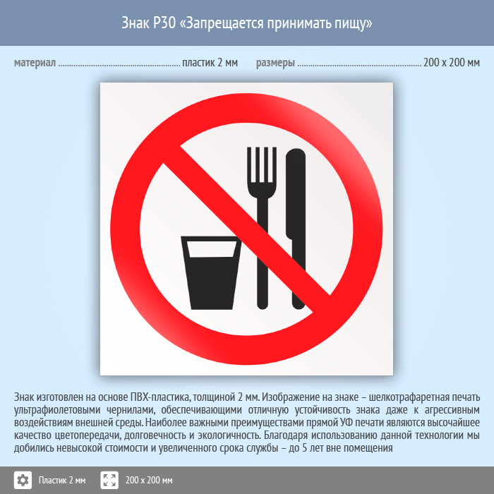 Знак P30 «Запрещается принимать пищу» (пластик, 200х200 мм) в Черкесске купить