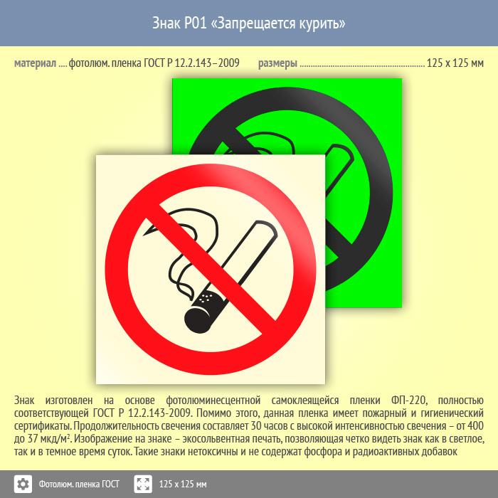 Знак P01 «Запрещается курить» (фотолюминесцентная пленка ГОСТ 34428-2018, 125х125 мм) в Черкесске купить
