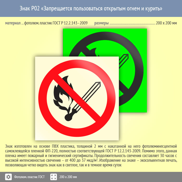 Знак P02 «Запрещается пользоваться открытым огнем и курить» (фотолюминесцентный пластик ГОСТ 34428-2018, 200х200 мм) в Черкесске купить
