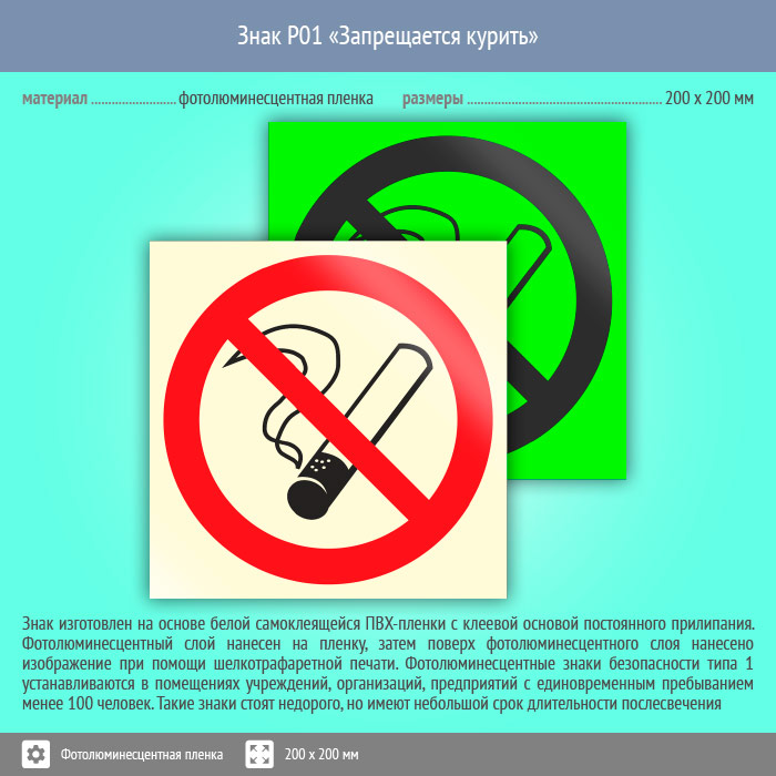 Знак P01 «Запрещается курить» (фотолюминесцентная пленка, 200х200 мм) в Черкесске купить