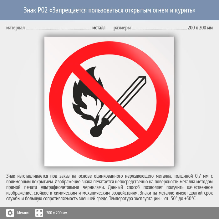 Знак P02 «Запрещается пользоваться открытым огнем и курить» (металл, 200х200 мм) в Черкесске купить