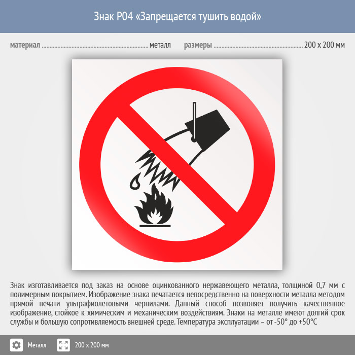 Знак P04 «Запрещается тушить водой» (металл, 200х200 мм) в Черкесске купить