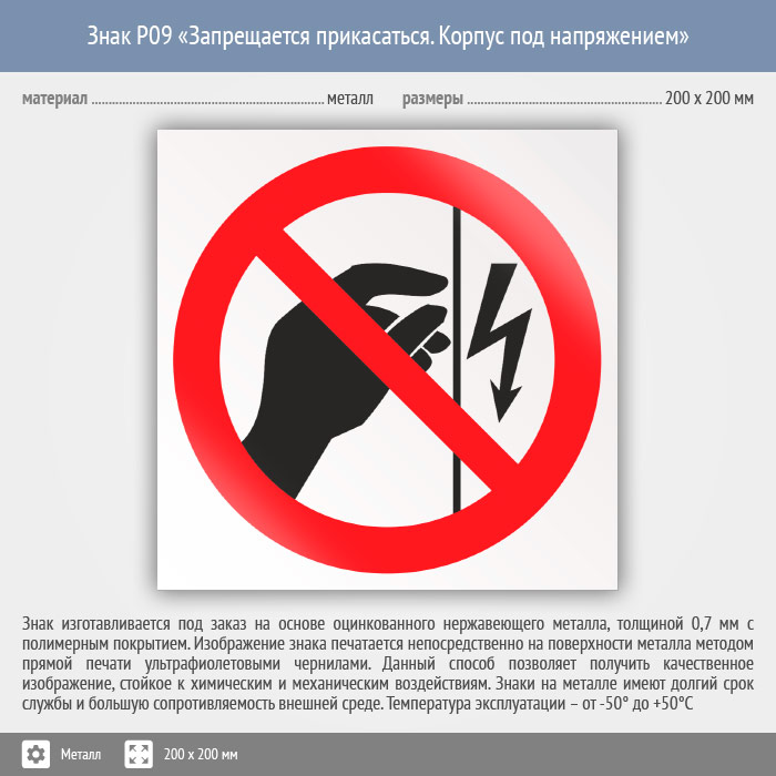 Знак P09 «Запрещается прикасаться. Корпус под напряжением» (металл, 200х200 мм) в Черкесске купить