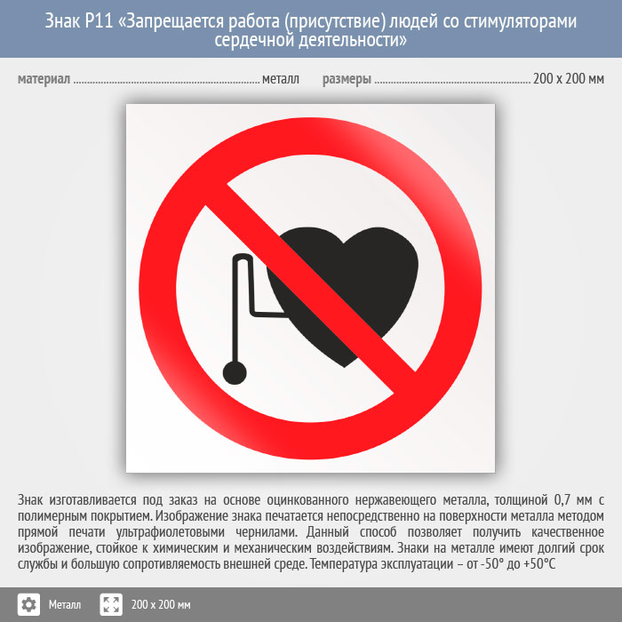 Знак P11 «Запрещается работа (присутствие) людей со стимуляторами сердечной деятельности» (металл, 200х200 мм) в Черкесске купить