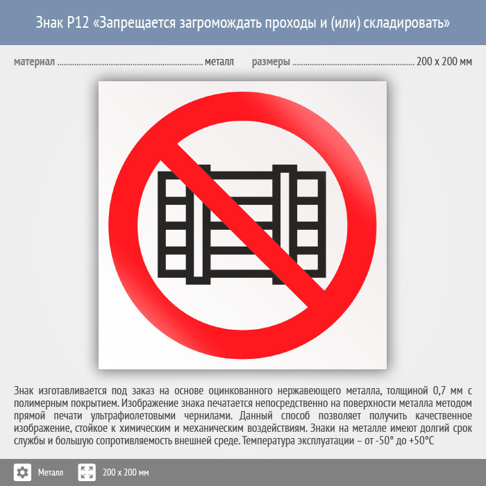Знак P12 «Запрещается загромождать проходы и (или) складировать» (металл, 200х200 мм) в Черкесске купить