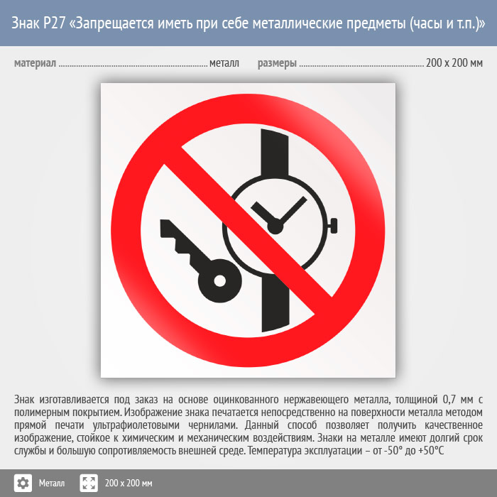 Знак P27 «Запрещается иметь при (на) себе металлические предметы (часы и т.п.)» (металл, 200х200 мм) в Черкесске купить