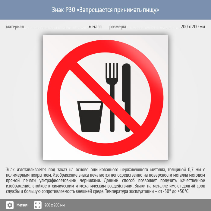 Знак P30 «Запрещается принимать пищу» (металл, 200х200 мм) в Черкесске купить
