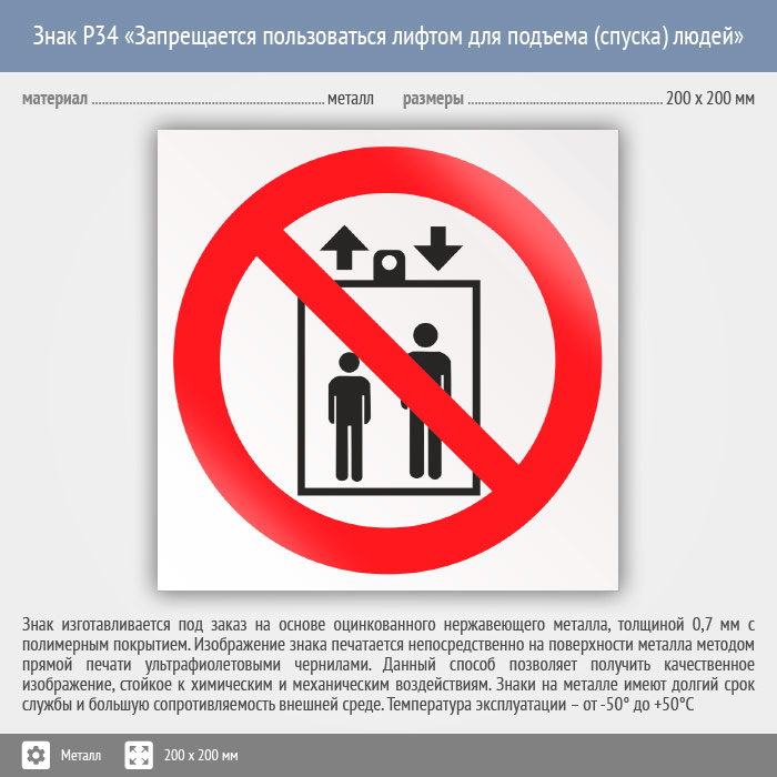 Знак P34 «Запрещается пользоваться лифтом для подъема (спуска) людей» (металл, 200х200 мм) в Черкесске купить