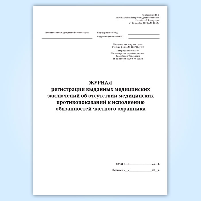 Журнал регистрации выданных медицинских заключений об отсутствии медицинских противопоказаний к исполнению обязанностей частного охранника (учетная форма № 002-ЧО/у-10) в Черкесске купить