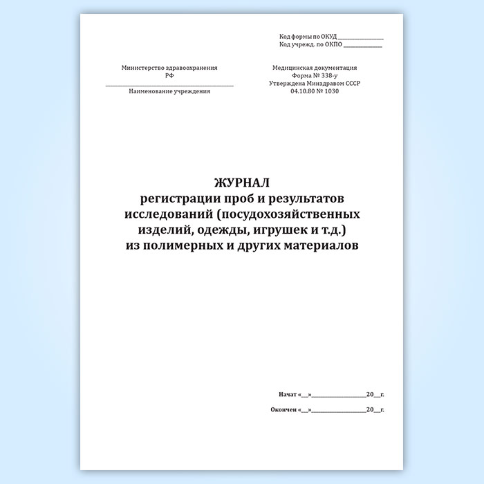 Журнал регистрации проб и результатов исследований (посудохозяйственных изделий, одежды, игрушек и т.д.) из полимерных и других материалов (форма № 338-у) в Черкесске купить