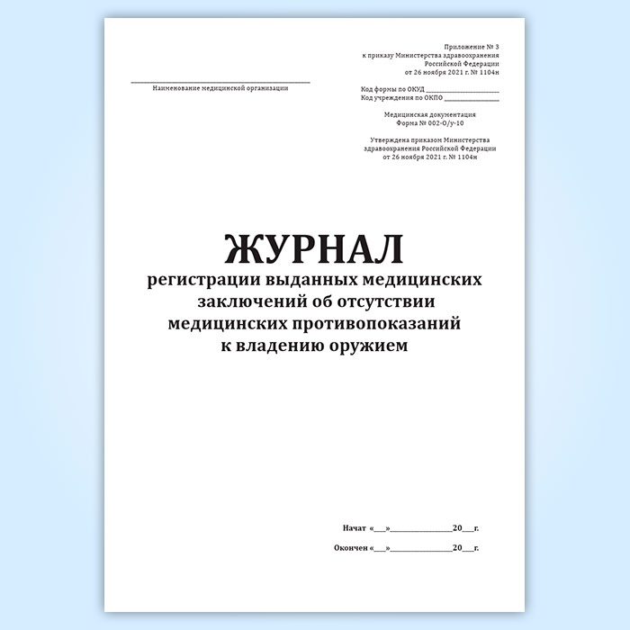 Журнал регистрации выданных медицинских заключений об отсутствии медицинских противопоказаний к владению оружием (форма 002-О/У-10) в Черкесске купить