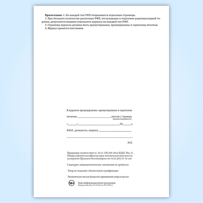 Приходно-расходный журнал учета радиофармпрепаратов, поступающих в подразделение радионуклидной терапии в готовом виде для непосредственного введения в организм пациента в Черкесске купить