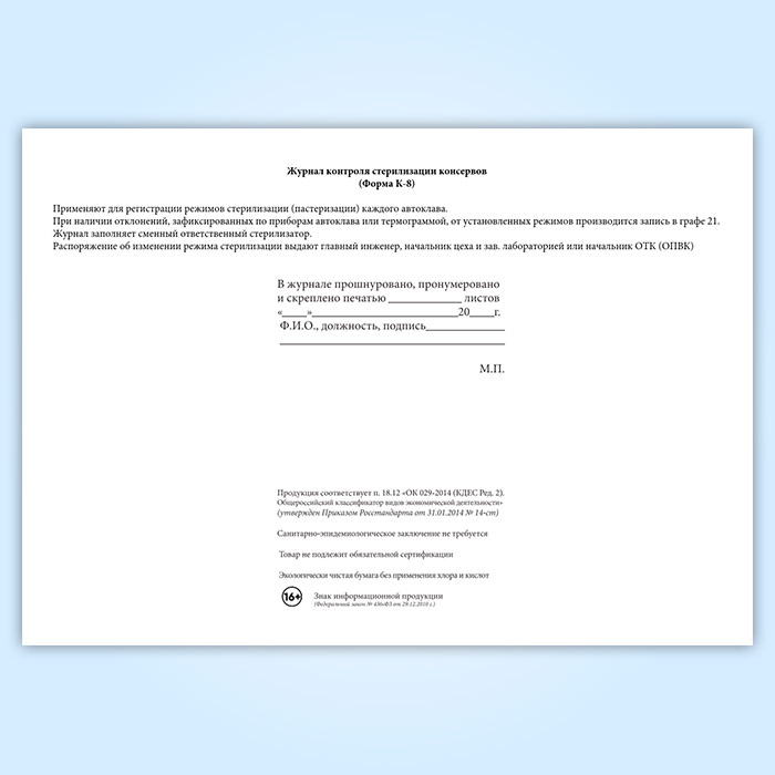Журнал контроля стерилизации консервов (форма К-8) в Черкесске купить