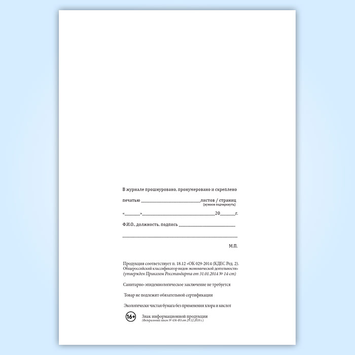 Вы получаете печатную продукцию прошнурованной и c местом для вашей печати в соответствии с действующими нормативными документами: