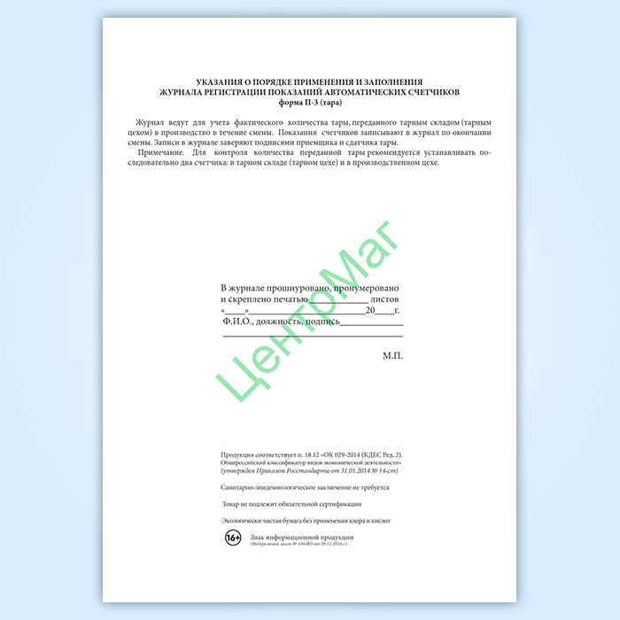Журнал регистрации показаний автоматических счетчиков (форма № П-3 тара) в Черкесске купить