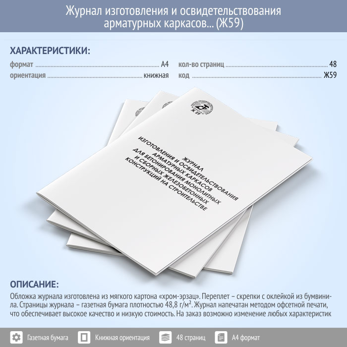 Журнал изготовления и освидетельствования арматурных каркасов для бетонирования монолитных и сборных железобетонных конструкций на строительстве (Ф-48) (48 стр., Ж59) в Черкесске купить