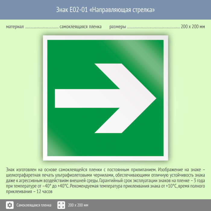 Знак «Направляющая стрелка» может быть изготовлен любого размера на самоклеящейся пленке, пластике толщиной 0.5, 2 или 4 мм и металле. Также возможно применение фотолюминесцентных и световозвращающих материалов