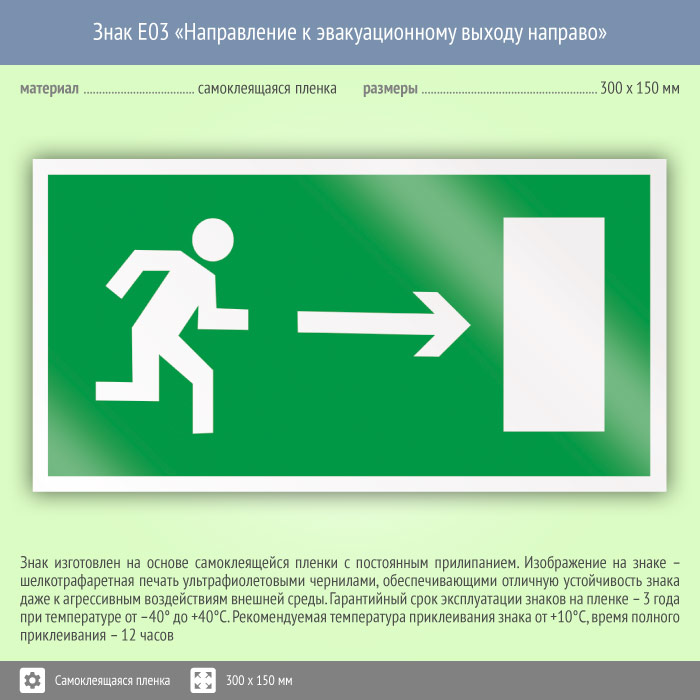 Знак «Направление к эвакуационному выходу направо» обозначает направление эвакуации к выходу в правую сторону. Код знака: E03