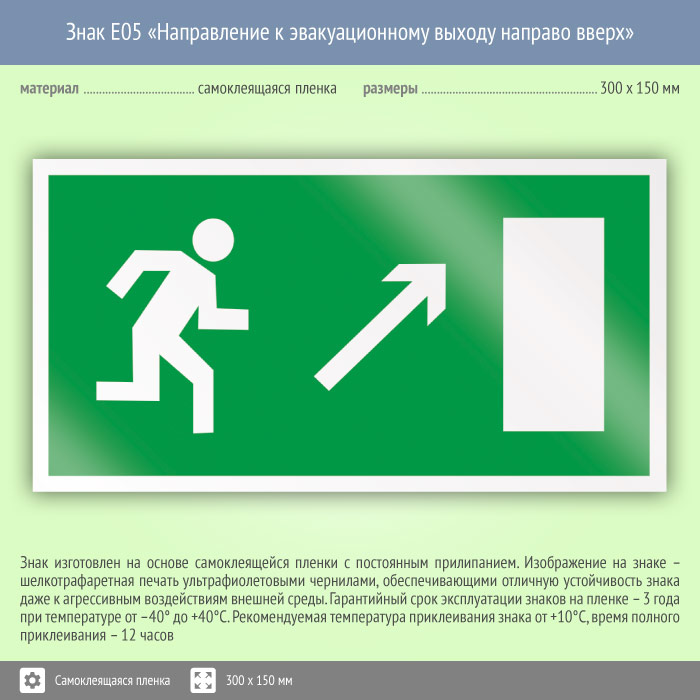 Знак E05 «Направление к эвакуационному выходу направо вверх» (фотолюм. пленка, 300х150 мм)