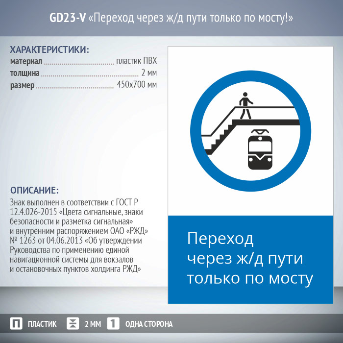Знак безопасности «Переход через ж/д пути только по мосту!» выполняется в одностороннем (металл и пластик) и двустороннем (только металл) виде на ПВХ-пластике, толщиной 2 мм или на листе оцинкованного металла, толщиной 0,8 мм. Размеры знаков - 450 мм х 700 мм (вертикальная ориентация) либо 540 мм х 220 мм (горизонтальная ориентация). Знаки изготавливаются в полном соответствии с ГОСТ Р 12.4.026-2015 «Цвета сигнальные, знаки безопасности и разметка сигнальная» и внутренним распоряжением ОАО «РЖД» № 1263 от 04.06.2013 «Об утверждении Руководства по применению единой навигационной системы для вокзалов и остановочных пунктов холдинга РЖД». По желанию заказчика возможно использование светоотражающих материалов. Так же при необходимости производим закругление углов знака