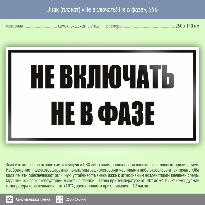 Знак «Не включать! Не в фазе» может быть изготовлен любого размера на самоклеящейся пленке, пластике толщиной 0.5, 2 или 4 мм и металле. Также возможно применение фотолюминесцентных и световозвращающих материалов