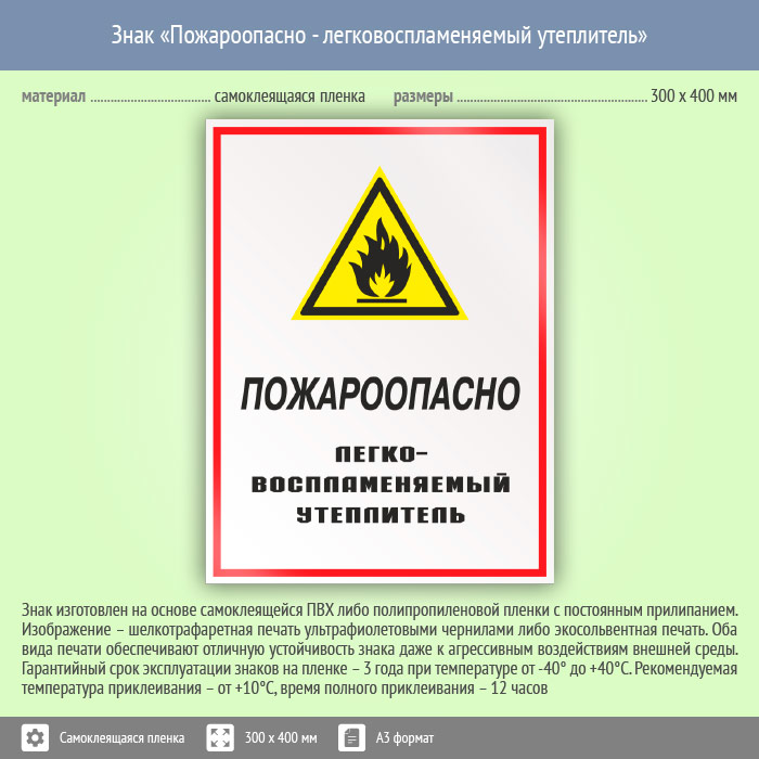 Знак «Пожароопасно – легковоспламеняемый утеплитель» может быть изготовлен любого размера на самоклеящейся пленке, пластике толщиной 0.5, 2 или 4 мм и металле. Также возможно применение фотолюминесцентных и световозвращающих материалов