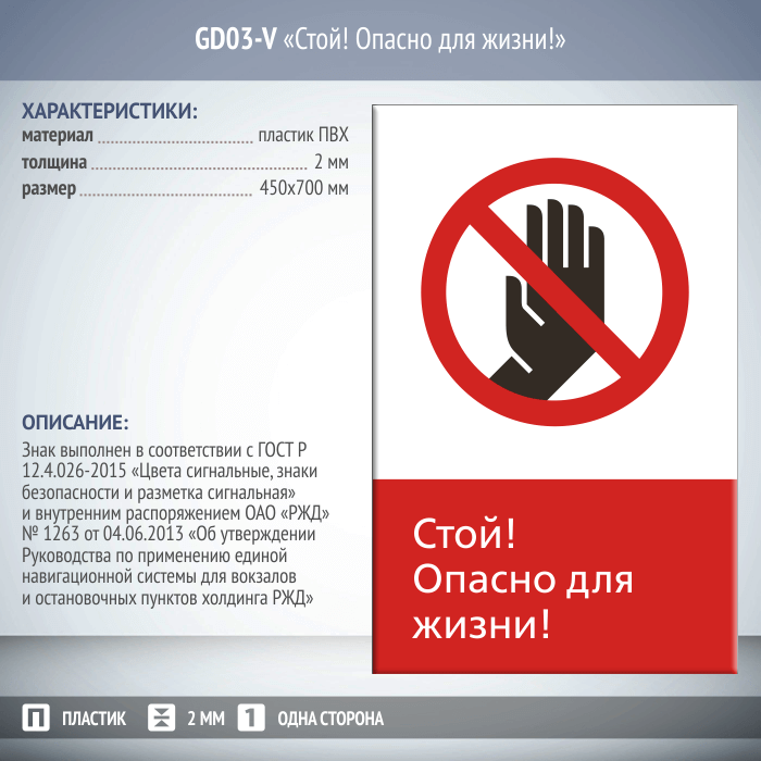 Знак безопасности «Стой! Опасно для жизни!» выполняется в одностороннем (металл и пластик) и двустороннем (только металл) виде, на ПВХ-пластике, толщиной 2 мм или листе оцинкованного металла, толщиной 0,8 мм. Размеры знаков - 450 мм х 700 мм (вертикальная ориентация) либо 540 мм х 220 мм (горизонтальная ориентация). Знаки изготавливаются в полном соответствии с ГОСТ Р 12.4.026-2015 «Цвета сигнальные, знаки безопасности и разметка сигнальная» и внутренним распоряжением ОАО «РЖД» № 1263 от 04.06.2013 «Об утверждении Руководства по применению единой навигационной системы для вокзалов и остановочных пунктов холдинга РЖД». По желанию заказчика возможно использование светоотражающих материалов. Так же при необходимости производим закругление углов знака