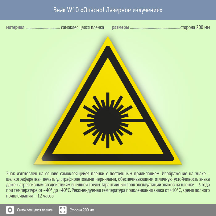 Знак «Опасно! Лазерное излучение» предупреждает о работе лазерного оборудования, представляющего угрозу неподготовленным. Код знака: W10