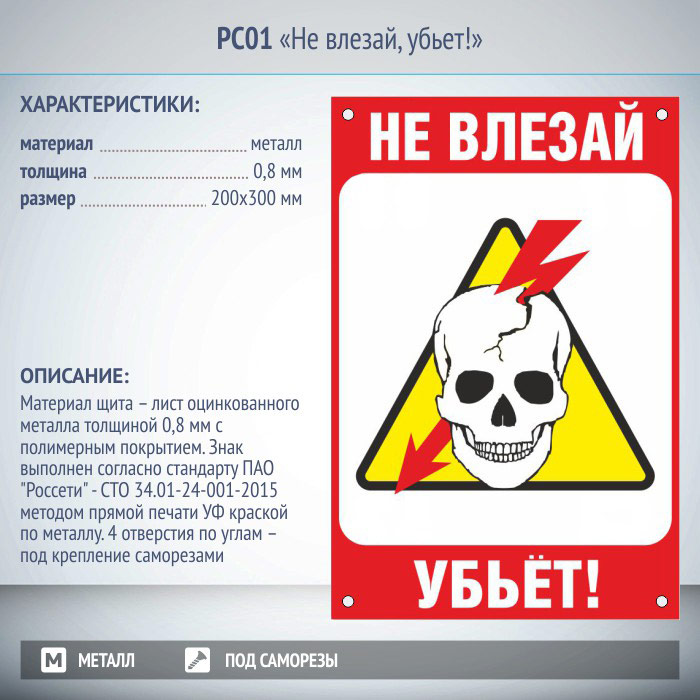 Знак «Не влезай, убьет!», РС01 (металл, 200х300 мм, отверстия под саморезы) в Черкесске купить