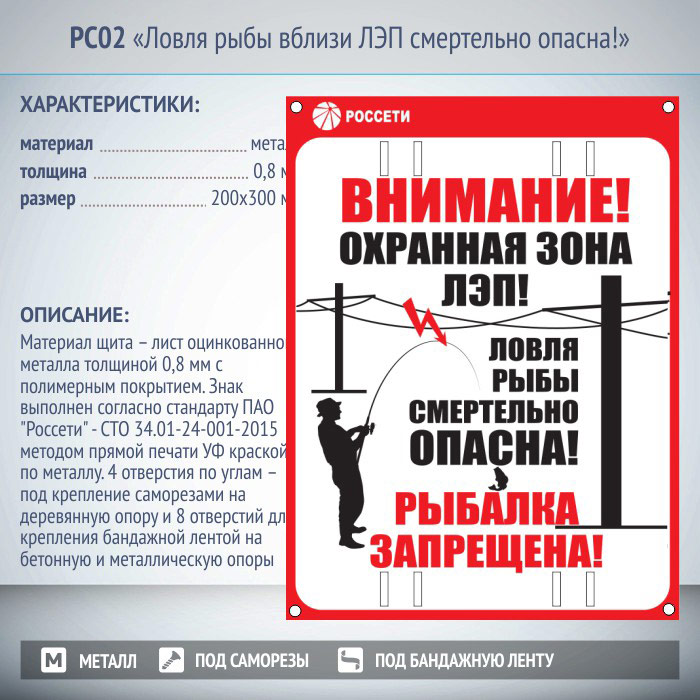 Знак «Ловля рыбы вблизи ЛЭП смертельно опасна!», РС02 (металл, 200х300 мм, отверстия под бандажную ленту) в Черкесске купить
