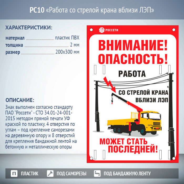 Знак «Работа со стрелой крана вблизи ЛЭП», РС10 (пластик 2 мм, 200х300 мм, отверстия под бандажную ленту) в Черкесске купить