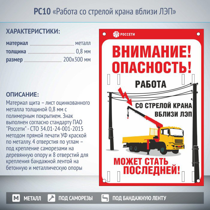 Знак «Работа со стрелой крана вблизи ЛЭП», РС10 (металл, 200х300 мм, отверстия под бандажную ленту) в Черкесске купить