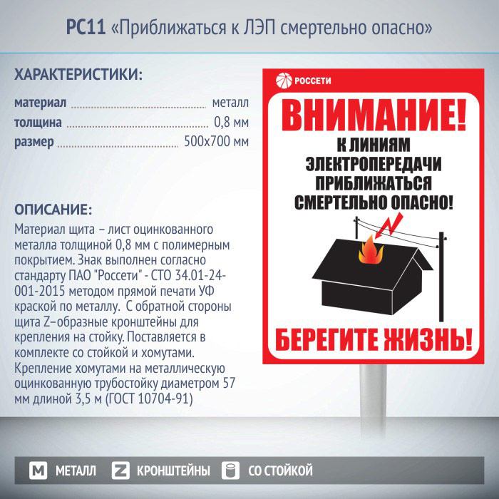 Информационный щит «Приближаться к ЛЭП смертельно опасно», РС11 (металл, 500х700 мм, с металлической стойкой) в Черкесске купить