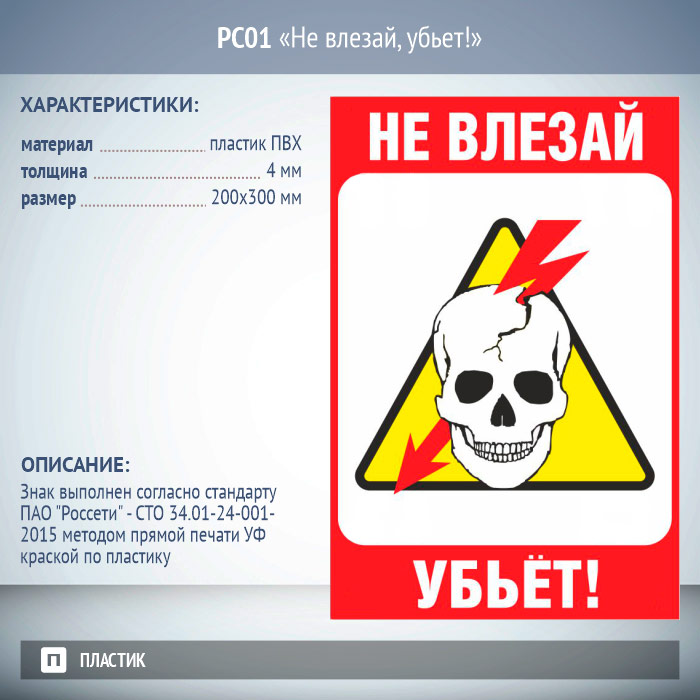 Знак «Не влезай, убьет!», РС01 (пластик 2 мм, 200х300 мм) в Черкесске купить