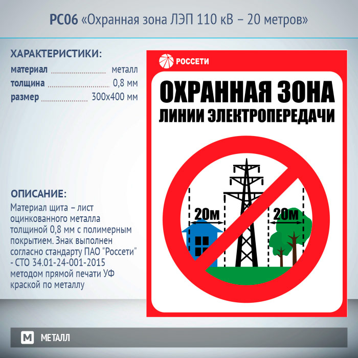 Знак «Охранная зона ЛЭП 110 кВ – 20 метров», РС06 (металл, 300х400 мм) в Черкесске купить