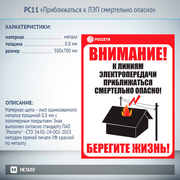 Информационный щит «Приближаться к ЛЭП смертельно опасно», РС11 (металл, 500х700 мм) в Черкесске купить
