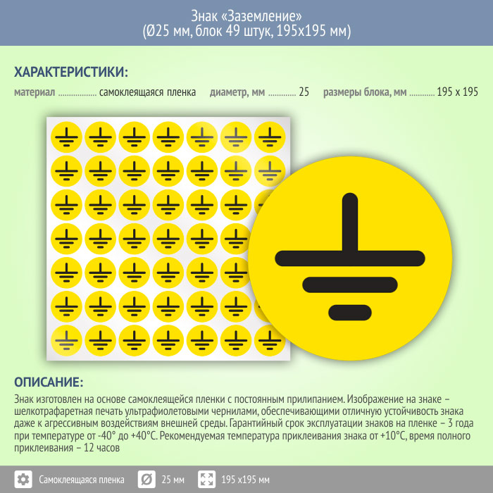 Знак (плакат) «Заземление», S46 (пленка, диаметр 25 мм, блок 49 штук, 195х195 мм) в Черкесске купить