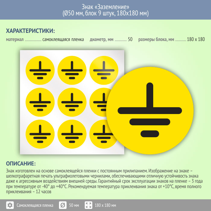Знак (плакат) «Заземление», S46 (пленка, диаметр 50 мм, блок 9 штук, 180х180 мм) в Черкесске купить