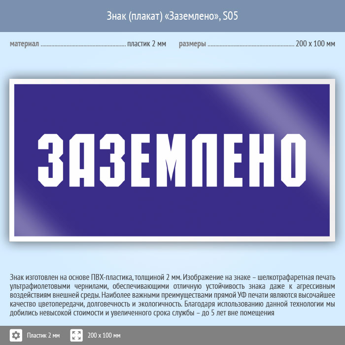 Знак (плакат) «Заземлено», S05 (пластик, 200х100 мм) в Черкесске купить