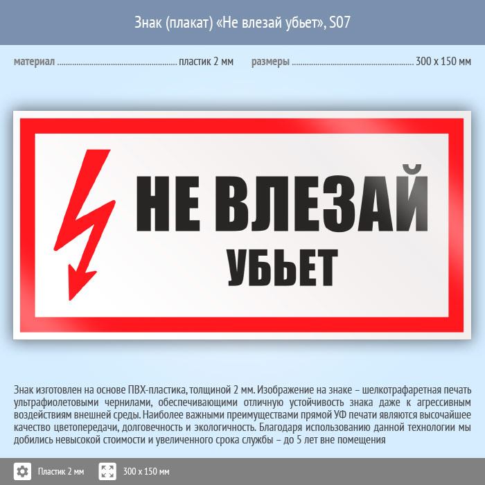 Знак (плакат) «Не влезай убьет», S07 (пластик, 300х150 мм) в Черкесске купить