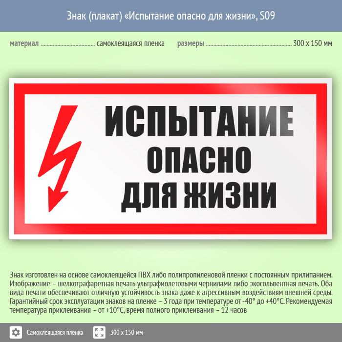 Знак (плакат) «Испытание опасно для жизни», S09 (пленка, 300х150 мм) в Черкесске купить