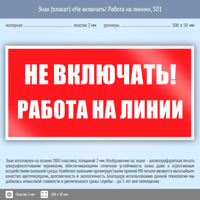 Знак (плакат) «Не включать! Работа на линии», S01 (пластик, 100х50 мм) в Черкесске купить