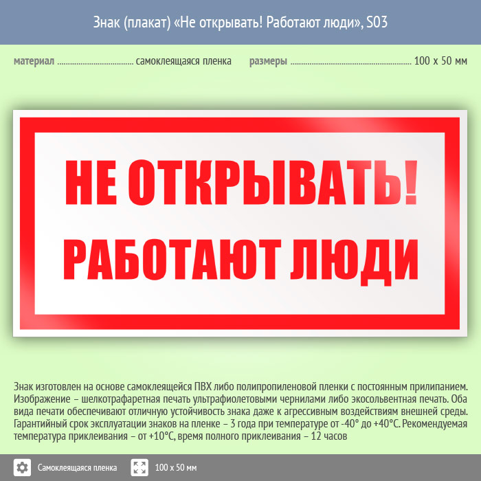 Знак (плакат) «Не открывать! Работают люди», S03 (пленка, 100х50 мм) в Черкесске купить