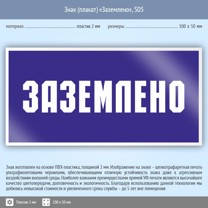 Знак (плакат) «Заземлено», S05 (пластик, 100х50 мм) в Черкесске купить